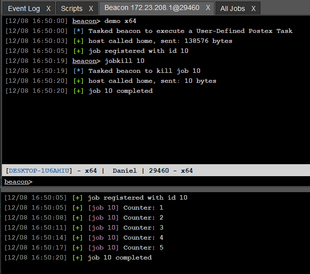 A common scenario for a long-running task is for it to run indefinity until cancelled by the operator (via the jobkill command). However, what I found when playing with the kit is that killing a job on the client-side doesn't forcefully terminate the DLL. So if you have a while (true) (or similar) loop in your PostexMain, Beacon will disconnect itself from the named pipe and you will no longer see any output on the client's console, but the DLL itself will never stop.
