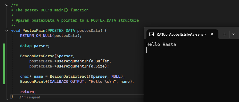 As with the C++ BOF and UDRL Visual Studio templates, we can provide mock arguments when running in debug mode.