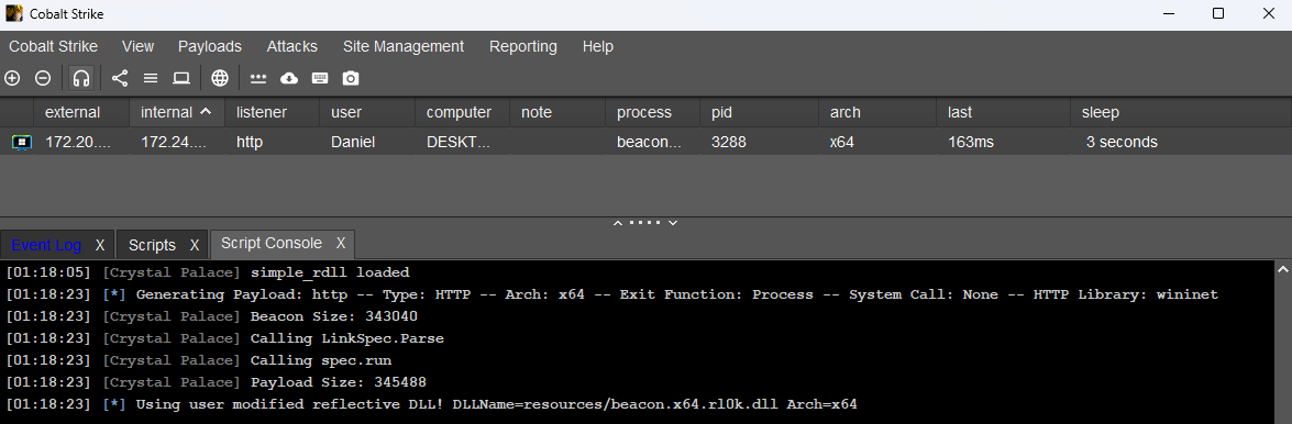 }The BEACON_RDLL_GENERATE hook is called each time a stageless Beacon payload is generated from the Cobalt Strike client, and allows users to replace the default reflective loader as described in the UDRL documentation. All we have to do here is get the path to the desired specification file and apply it to the raw Beacon DLL that gets passed is the $2 variable. Crystal Palace takes care of all the hard work.