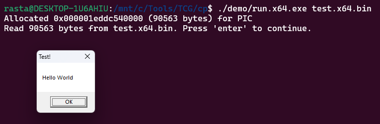 rasta@DESKTOP-1U6AHIU:/mnt/c/Tools/TCG/cp$ ./link ../garden/simple_rdll/loader.spec demo/test.x64.dll test.x64.binThe magic behind how these .spec files work can be found in the project's documentation. The result is shellcode blob that can be injected into a process.