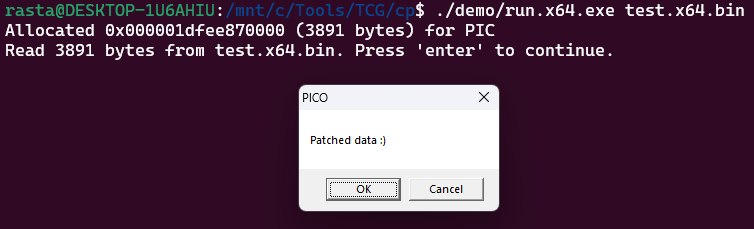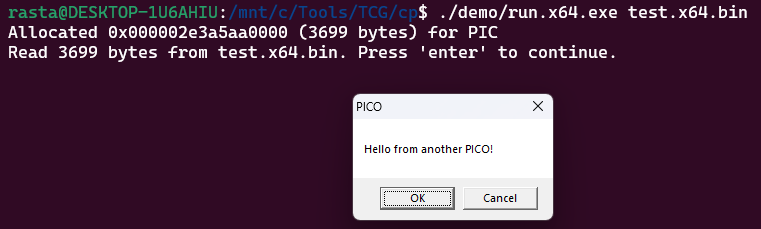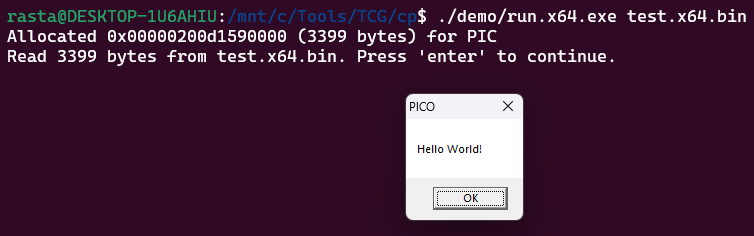 $ ./piclink ../garden/pico_demo/loader.spec x64 test.x64.binThe included run utility (which is just a shellcode runner) should produce the message box.